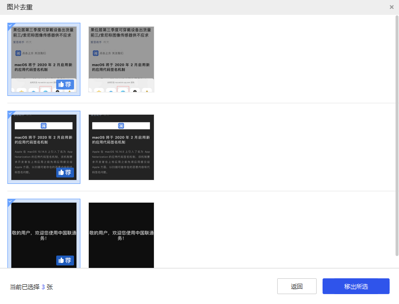 4. 扫描完毕,爱思助手会罗列出所有重复图片,并且自动推荐更优质的图片,大家自行勾选,点击“移出所选”,即可导出保存图片。