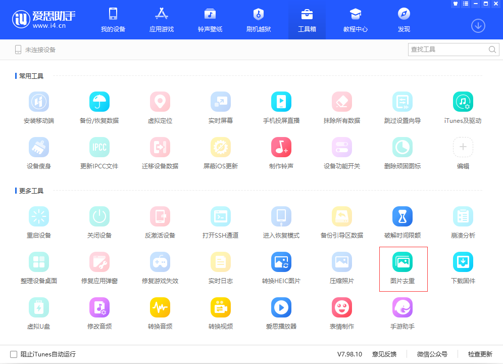 1. 打开爱思助手PC端,进入界面,点击“工具箱”——“更多工具”——“图片去重”;如果找不到该工具,首先检查爱思助手软件版本,然后在右上方的搜索框中输入图片去重,进行查找,