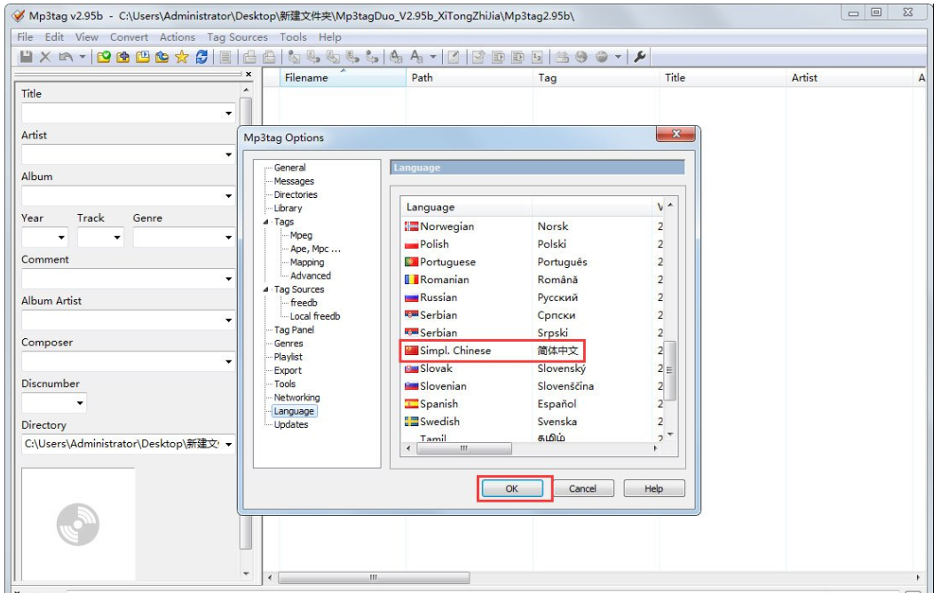 弹出 Mp3tag Options设置面板,点击【Language】—>【Simpl Chinese】,选择简体中文,点击OK,