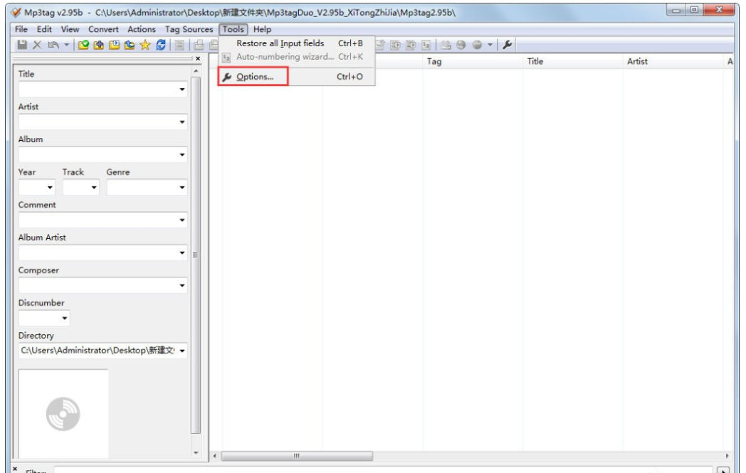 从本站下载安装 Mp3tag ,打开软件,进入界面,如图,在菜单栏中点击【Tools】—>【Options】选项,
