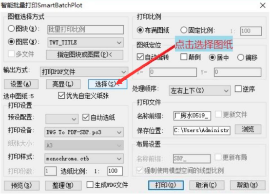 4. Smartbatchplot 的设置弄好后,接下来,点击“选择”按钮,选择需要批量打印的 CAD 图纸。