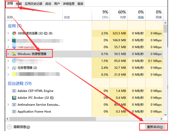 2. 在【进程】中找到【Windows资源管理器】选中,点击右下方【重新启动】
