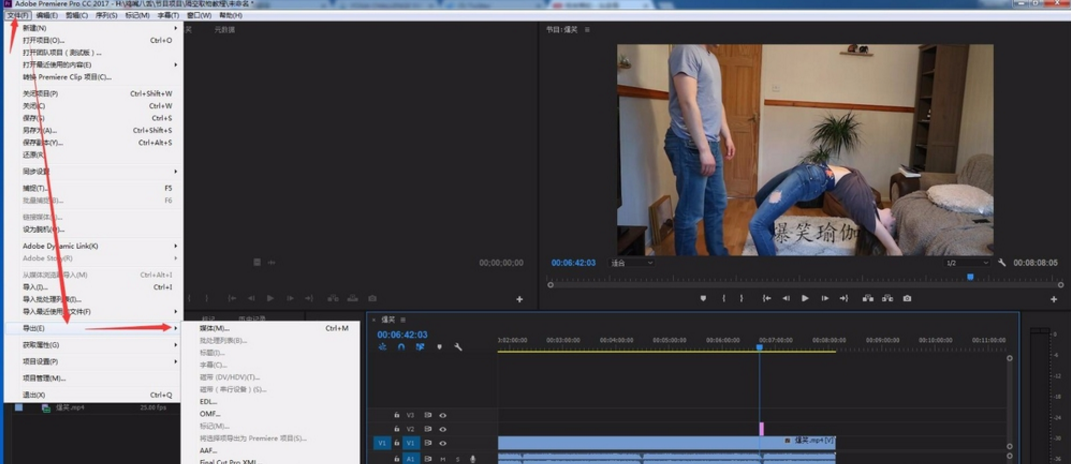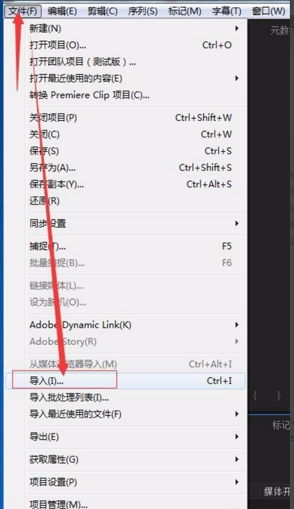 1. 打开 Adobe Premiere 软件,点击菜单栏的 “文件”—> “导入”将视频素材导入进来,如图所示。