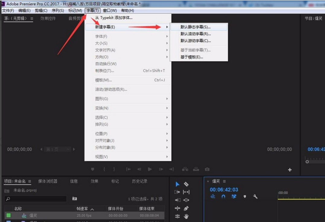 4. 点击菜单栏的 “字幕”—> “新建字幕”—> “默认静态字幕”进行新建字幕操作。