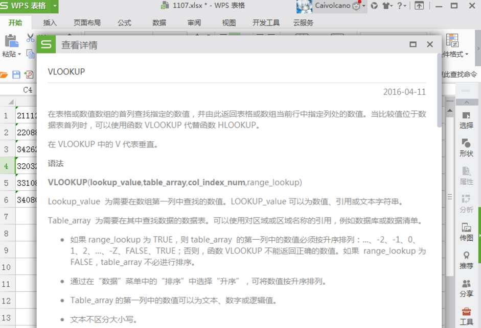 在第二列里用 vlookup 函数,这是一个查找函数,按列查找。我们需要查询这一列所需查询序列对应的值。