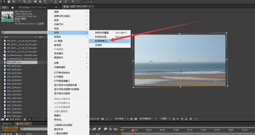选中后点击鼠标右键,选择时间 -> 时间伸缩,