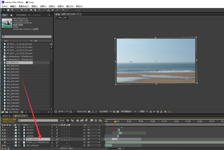 打开 Adobe After Effects 软件,导入视频,选中需要处理的视频片段,