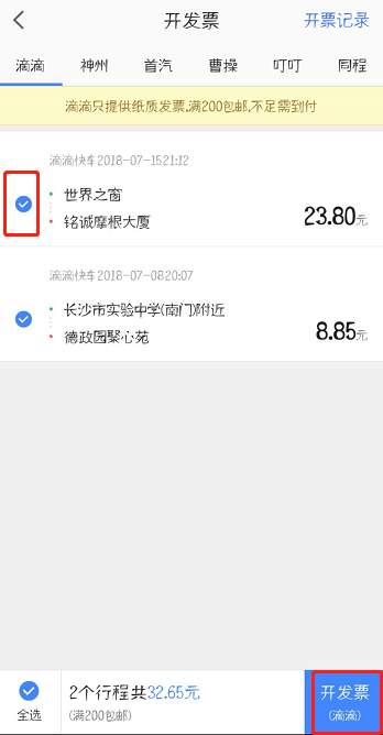 4. 勾选行程,然后点击“开发票”即可,