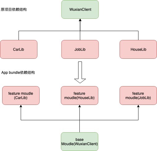 从上图可以看出,使用 AAB,项目的依赖结构发生了变化。有 base 和 feature 模块,在 base 中无法直接引用 feature 模块的类,feature 模块可以直接依赖 base 模块。