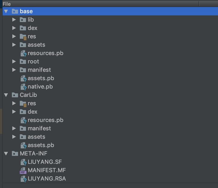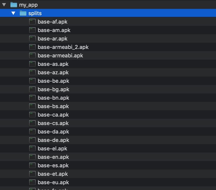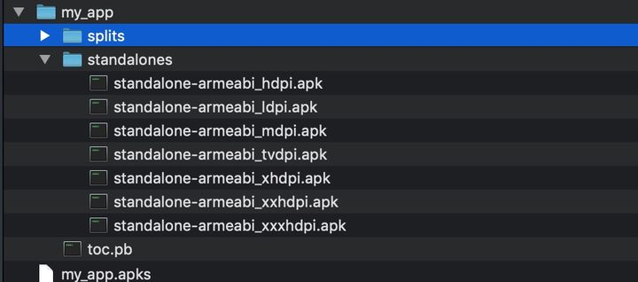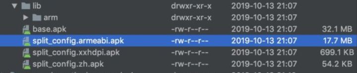 splits目 录:可以看出 splits 就是对各个 moudle 的在资源维度,ABI 维度和 Language 维度的拆分。base moudle 和 car moudle 基于维度各自产生了 apk 集合。当我们使用 app bundle 上传到 google play 后,在 google play 安装 apk 时(手机 android 版本>=21 即android 5.0),google play 就会在 apk 集合中找到和手机语言,API,分辨率相同的 apk 安装到手机从而减少 apk 大小。