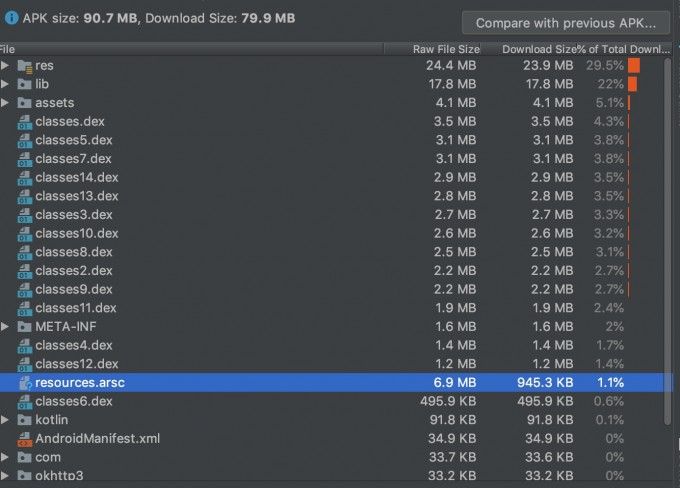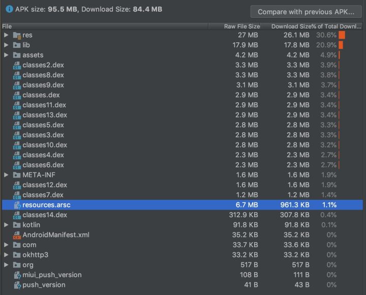 我们是基于 9.1.0 版本只对二手车业务进行了改造发现生成全量 apk 包大小为(95.5 M)增加了 4.8 M,那这些大小增加在哪里呢?