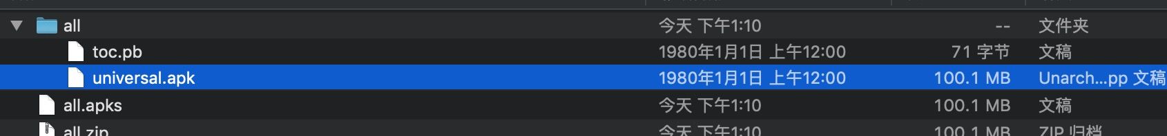 bundletool 只生成一个包含应用的所有代码和资源的 APK,以使该 APK 与应用支持的所有设备配置兼容,使用 universal 参数。