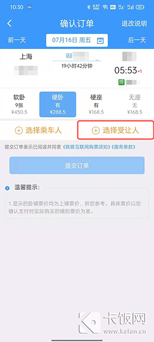 4、点击【选择受让人】选择需要乘坐的乘客;