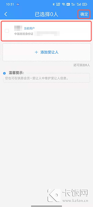 5、勾选需要乘坐的乘客信息,可点击添加受让人,选择好后点击右上角的【确定】;