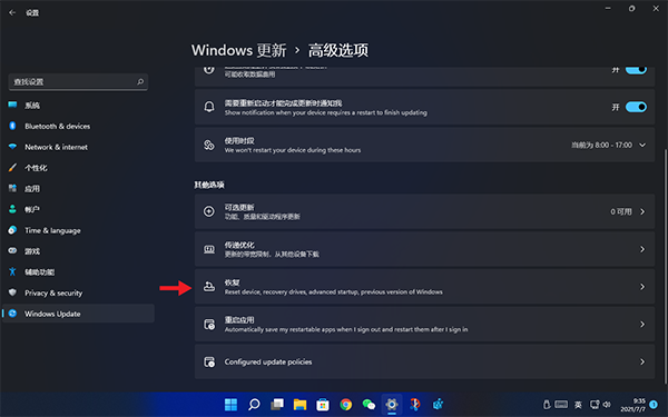 4、在高级选项中会提供一个【恢复】服务,如果不显示就表示您的系统已过了回滚有效期;