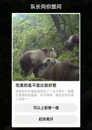 在支付宝蚂蚁森林保护地巡护玩法中,其中有一个问题是问吃素的是不是比较好惹?我们在野外遇到羚牛应该怎么做,正确的答案是什么呢,下面就和小编一起来看看吧!