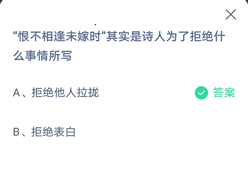蚂蚁庄园中的每日一题都是比较简单的,但是也有用户没有接触的知识层面,其中恨不相逢未嫁时其实是诗人为了拒绝什么事情所写?下面就让小编给大家介绍一下。
