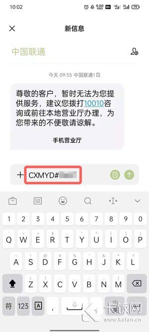 3、编辑内容【CXMYD#本手机号对应证件号后四位】或者【 598#本手机号对应证件号后四位】发送;