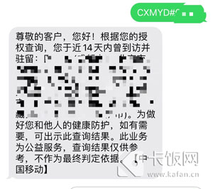 4、发送短信后等待回复,即可获得如下图所示的信息内容,从中获得最近14天出行信息。