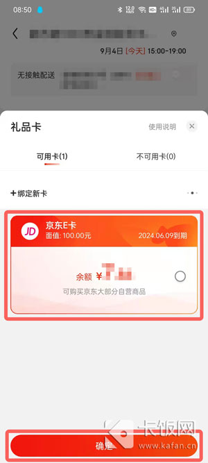 4、选中需要消耗的京东E卡,点击下方的【确认】;