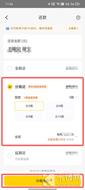 4、可选择自己需要的分期还款金额、分期期数等,点击【分期还款】按钮;