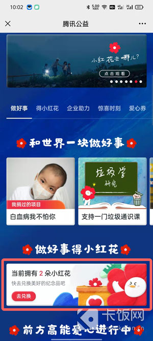 2、在腾讯公益99公益日活动中,下滑到【得小红花】,点击【去兑换】;