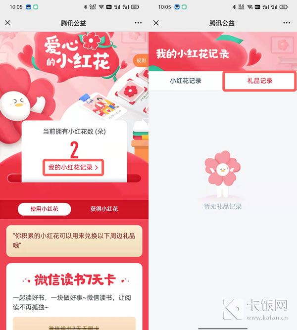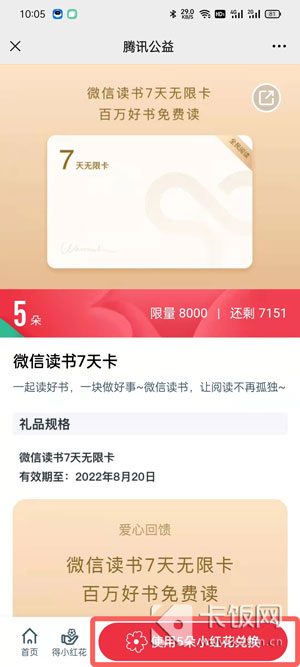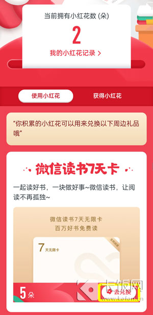 在腾讯公益中获得的小红花,可直接用来兑换微信读书7天卡、小红花胸针、小红花抱枕、小红花冰箱贴、环保单肩包、小红花T恤、公益五彩原蜜。