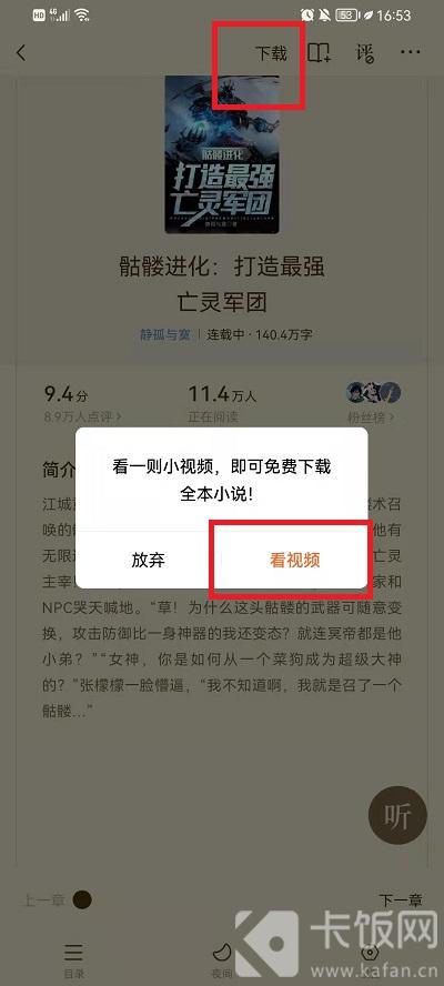 2、然后在其中我们需要点击屏幕中间,然后会弹出功能界面,我们只需要点击上方的【下载】,然后在弹出的选择中点击【看视频】即可进入到视频观看界面,观看十几秒的视频以后,我们就可以下载小说了,不看视频是下载不了的;