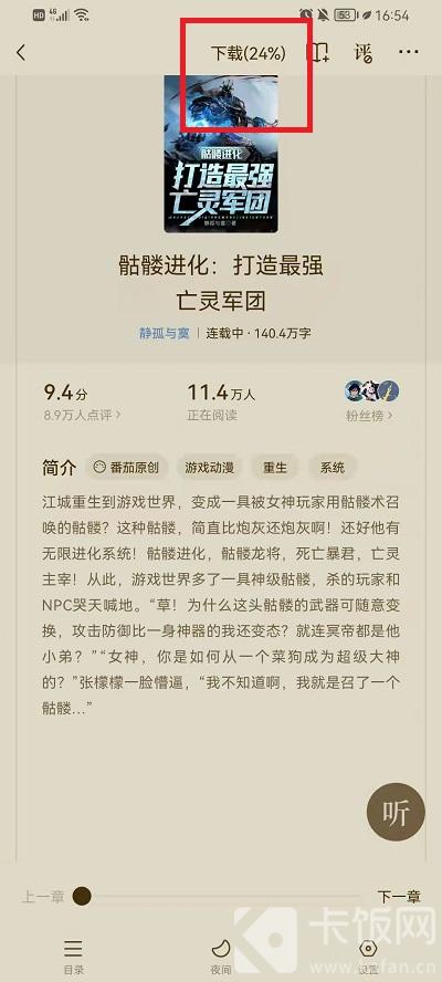 3、看完视频后,我们点击关闭视频,然后回到小说界面可以看到上方会显示下载进度,一分钟就可以下载完毕;