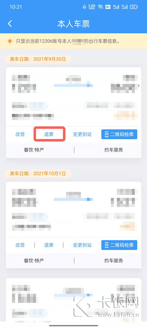 3、以本人车票为例,找到车票后,点击【退票】申请退票;