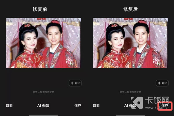 5、通过【对比】查看修复前后的区别,点击【保存】可保存修复后的老照片。