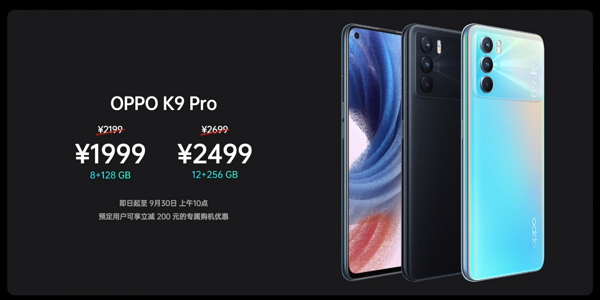 OPPOk9pro采用立体双扬声器,该机提供“黑曜武士”和“冰河序曲”两种配色,后盖采用微米级“一体化不等厚壁”注塑工艺,8+128GB 版本 2199 元,首发 1999 元,12+256GB 版本 2699 元,首发 2499 元,9 月 30 日上午十点开售。