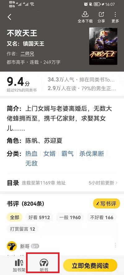 2、在书籍的详情页中,我们可以看到下方有一个【听书】按钮,我们点击听书按钮,就可以加载听书模式,进入到听书模式中;