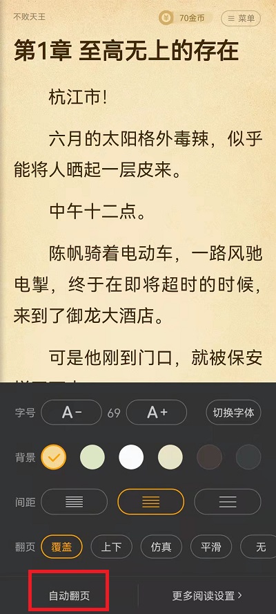 3、在阅读设置界面中,我们点击左下角的【自动翻页】就可以进行到自动阅读模式中。