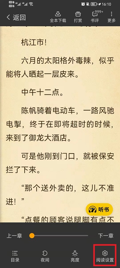 2、在小说内容页面中,我们需要点击中间的屏幕,然后呼出小说功能,在弹出的功能中,点击右下角的【阅读设置】;