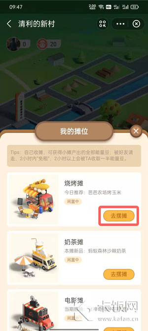 Tips:自己收租,可以获得小摊产出的全部能量豆;被好友请走,2小时内“免租”,2小时以上会被TA收取一半能量豆。