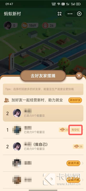 3、在自己的好友中,找到同样开启蚂蚁新村玩法的好友,并且该好友拥有空余摊位;