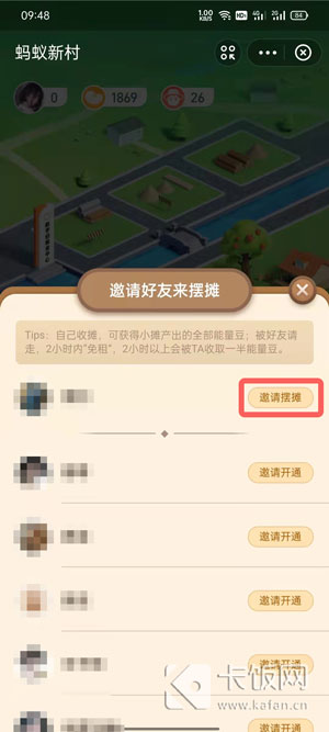 7、然后找到开通了蚂蚁新村的好友,点击右侧的【邀请摆摊】;