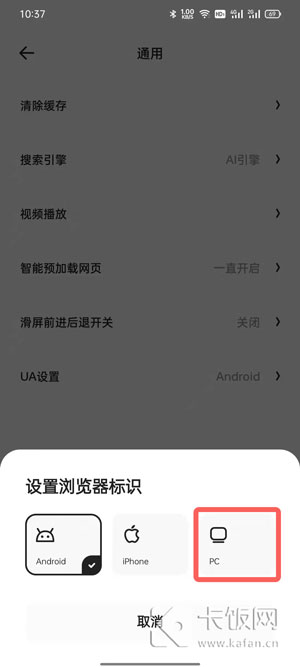 4、切换至【PC】UA即可使用电脑模式;