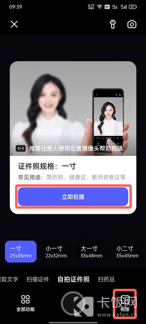 3、可现场拍摄一张一寸白底证件照,或者从相机中选择拍摄好的白底证件照(之后可通过“规格”裁剪成一寸照片);