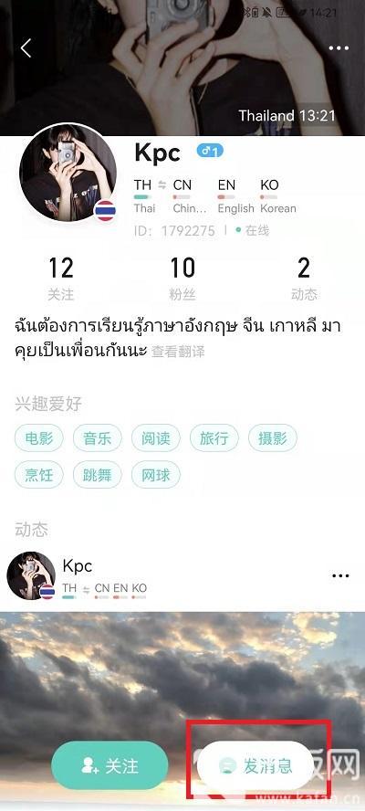 1、在软件中,推介界面,其中有很多来自世界各地的好友,我们可以随意的挑选一个国家的好友,然后点击此好友,进入到好友的个人主页;