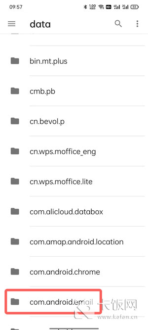 4、在文件应用中,继续打开【Android>data】文件夹,再点击【com.android.email】文件夹;