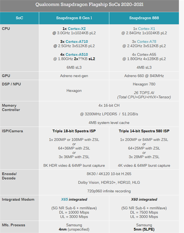 1、骁龙8 Gen1采用三星4nm工艺,而骁龙888采用三星5nm的工艺;