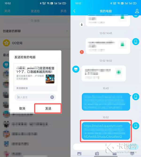 3、选择任意联系人发送配音视频,然后再打开对应的聊天窗口,点击发送的链接打开;
